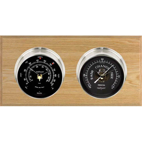 Wind and barometric pressure instruments housed in nickel-plated, solid brass cases with black dials and white numerals, on an oak panel.