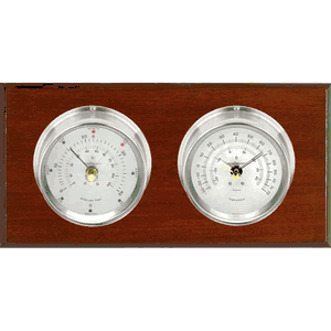 Wind (2-scale) and temperature instruments housed in nickel-plated, solid brass cases with silver dials and black numerals, on a mahogany panel.