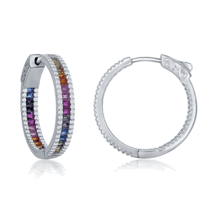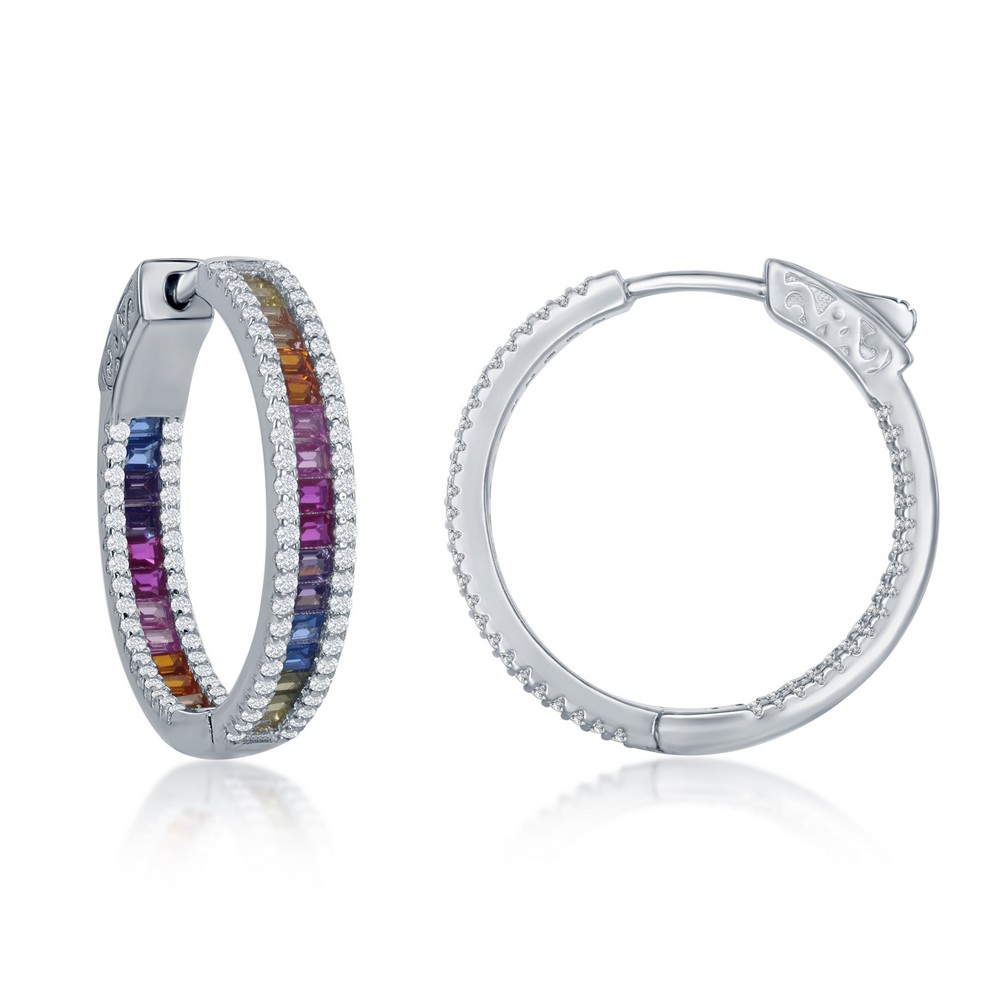 Classic Of New York Sterling Silver 4x25mm Center Rainbow Channel-Set and White CZ Border Hoop Earrings